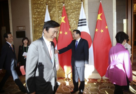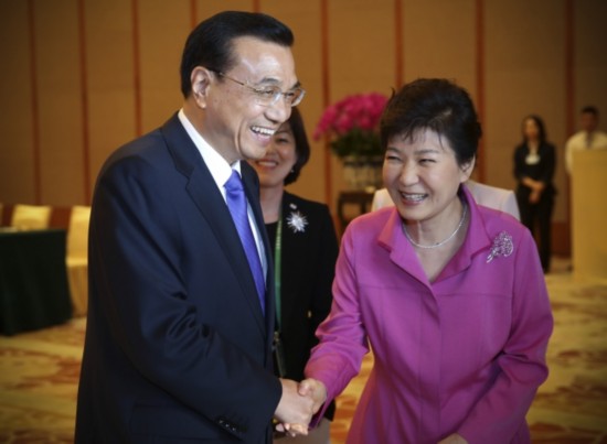 韓國總統(tǒng)樸槿惠對李克強總理表示:"韓中日三國合作有利于地區(qū)和平穩(wěn)定。要引導日本抱著正確的歷史觀,為東北亞和平做出貢獻。"